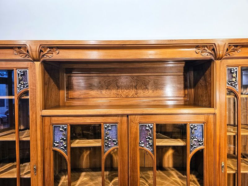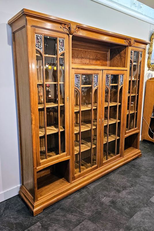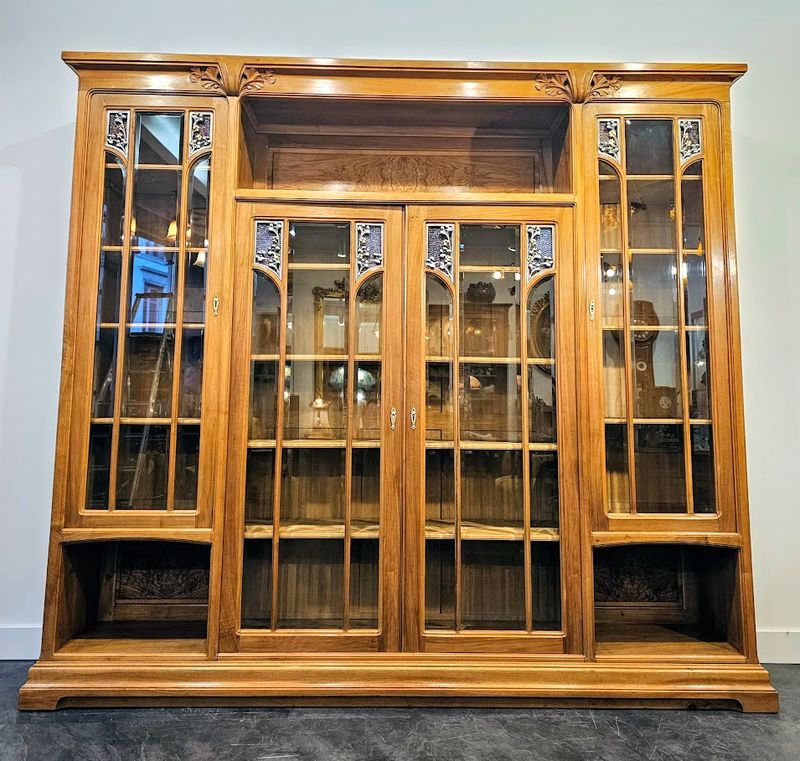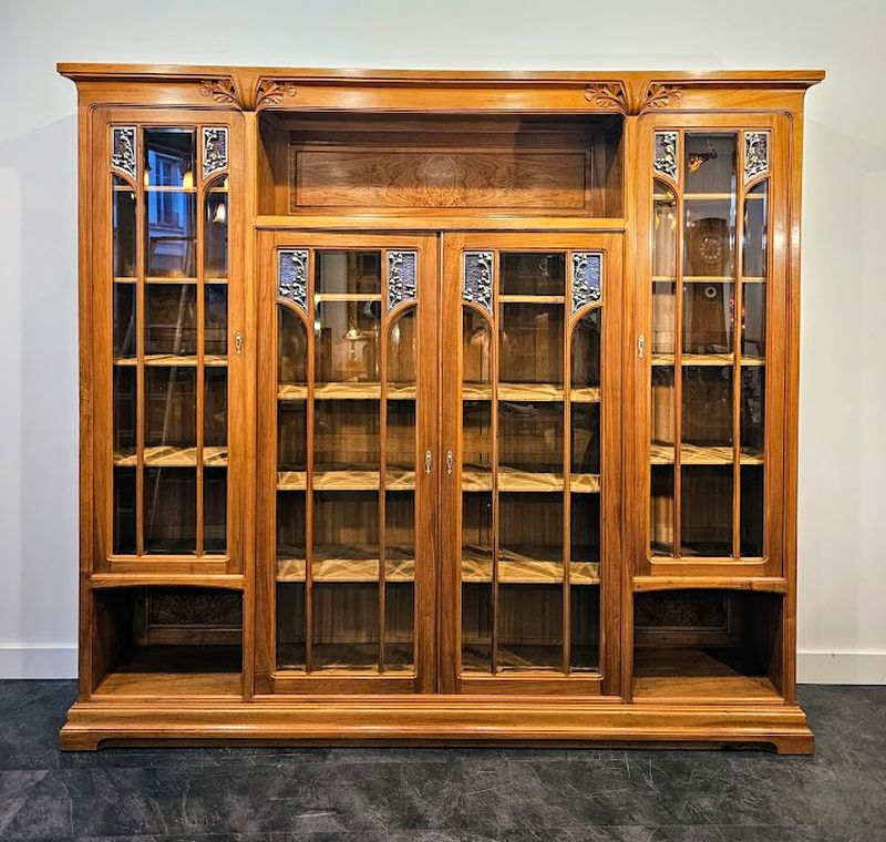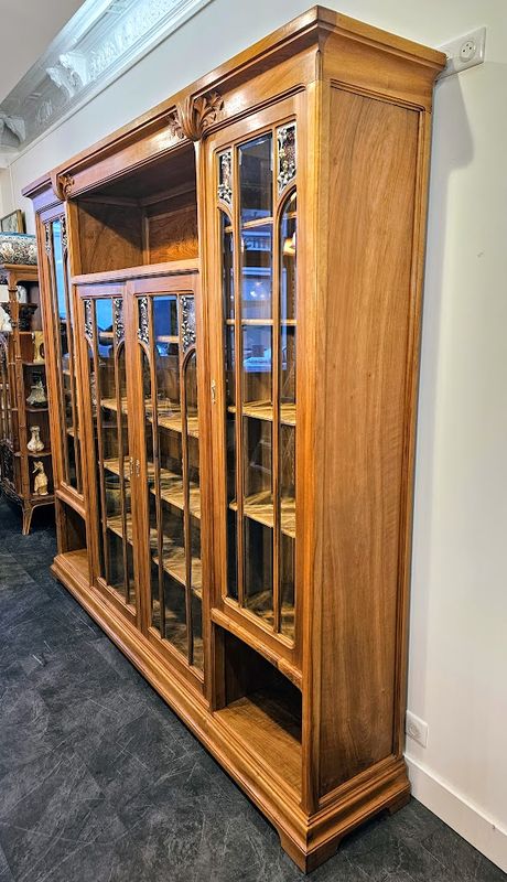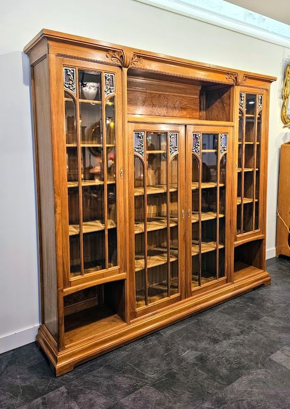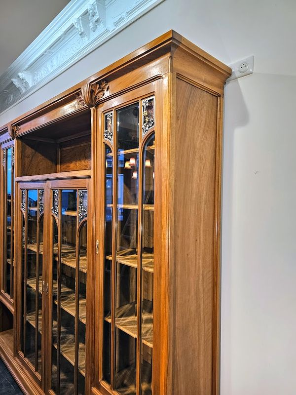 Importante bibliothèque en noyer massif mouluré et sculpté à décor de ginkgo biloba. Elle ouvre par quatre portes et trois niches, les portes sont compartimentées et présentent des ferronneries au décor, réhaussant des plaques en verre irisé de couleur mauve. Elle repose sur un important socle mouluré, les niches disposent de panneaux en ronce de noyer, toutes les vitres sont biseautées, les rayonnages sont modulables en hauteur, entrées de serrures et clefs en bronze doré. Superbe qualité d'ébénisterie, très belle patine, et parfait état d'origine!