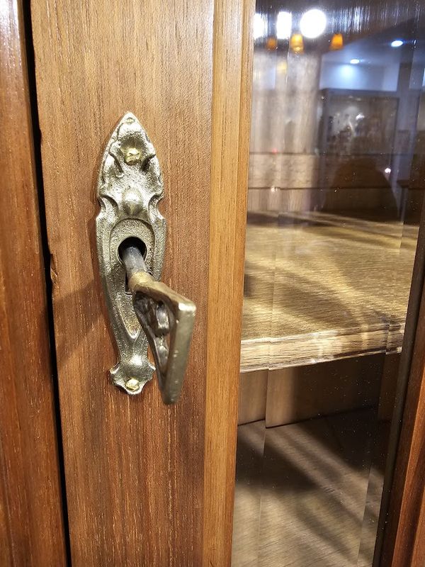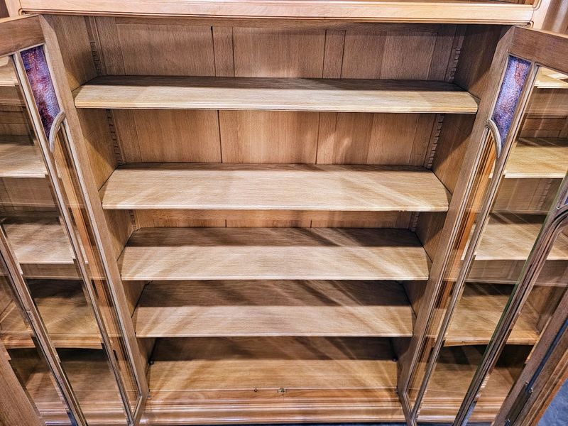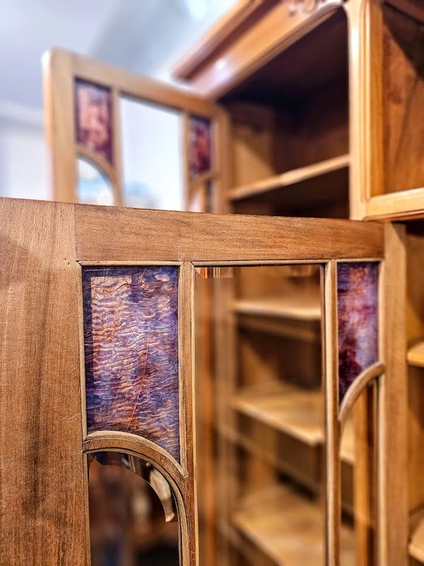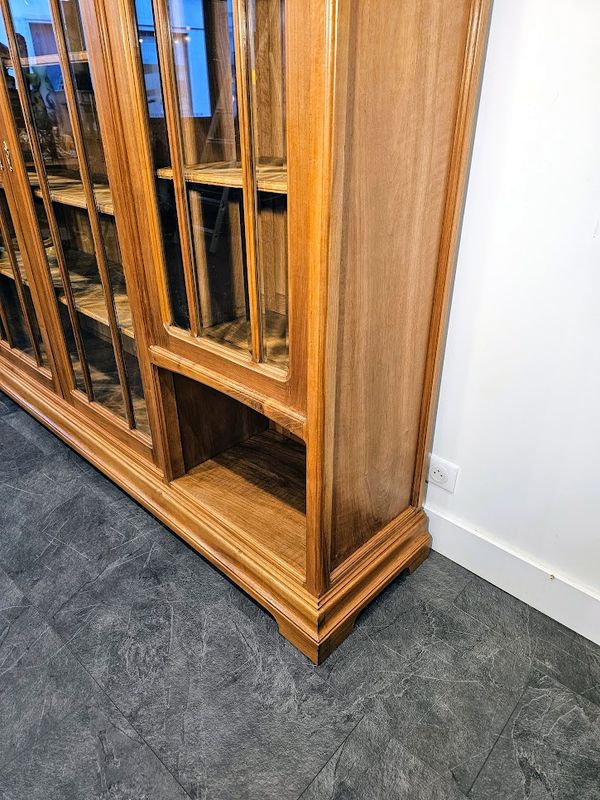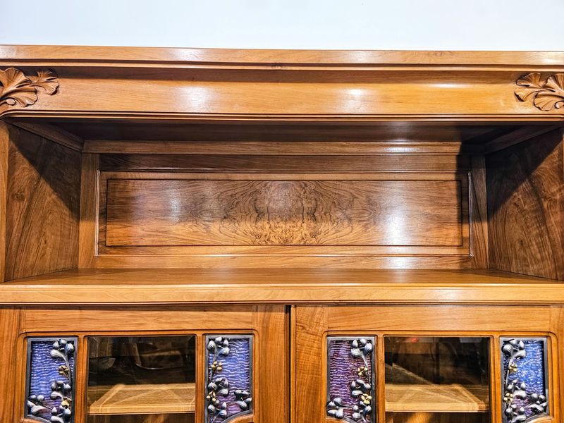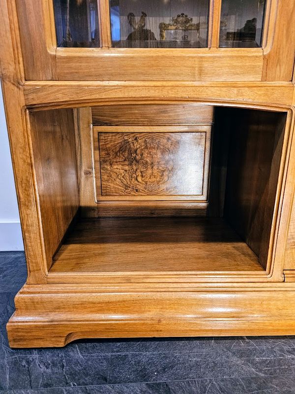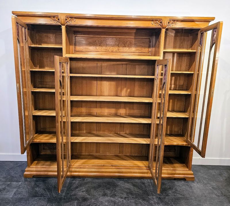 Importante bibliothèque en noyer massif mouluré et sculpté à décor de ginkgo biloba. Elle ouvre par quatre portes et trois niches, les portes sont compartimentées et présentent des ferronneries au décor, réhaussant des plaques en verre irisé de couleur mauve. Elle repose sur un important socle mouluré, les niches disposent de panneaux en ronce de noyer, toutes les vitres sont biseautées, les rayonnages sont modulables en hauteur, entrées de serrures et clefs en bronze doré. Superbe qualité d'ébénisterie, très belle patine, et parfait état d'origine!