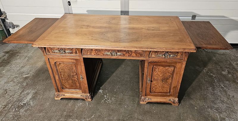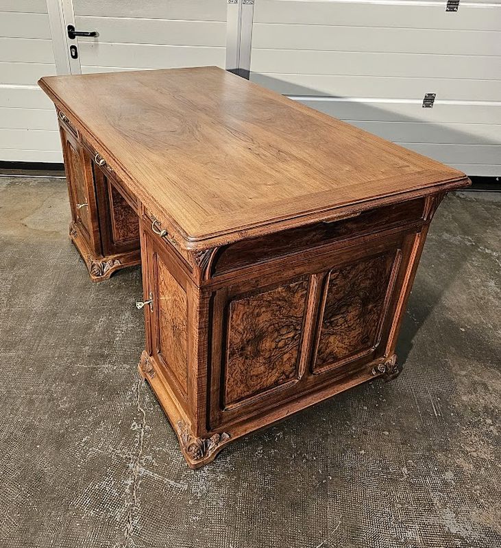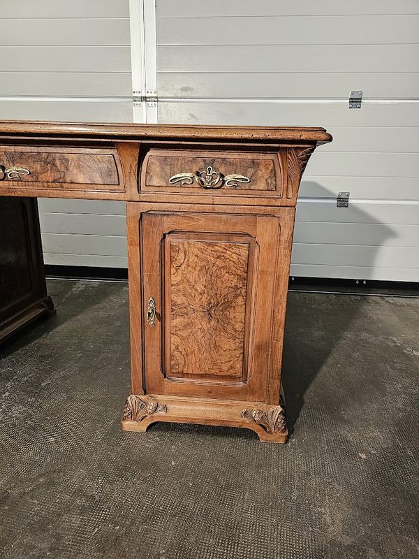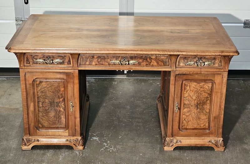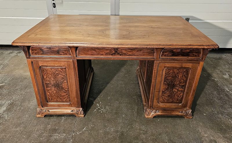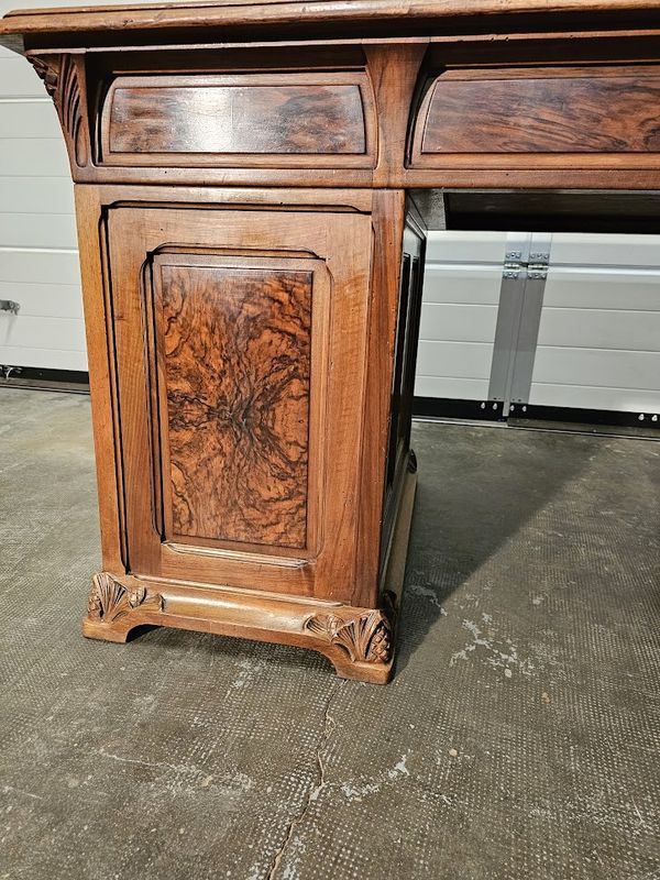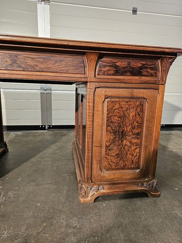 Bureau plat à caisson en noyer massif et placage de noyer dans la ronce, mouluré et sculpté à décor de pommes de pin.