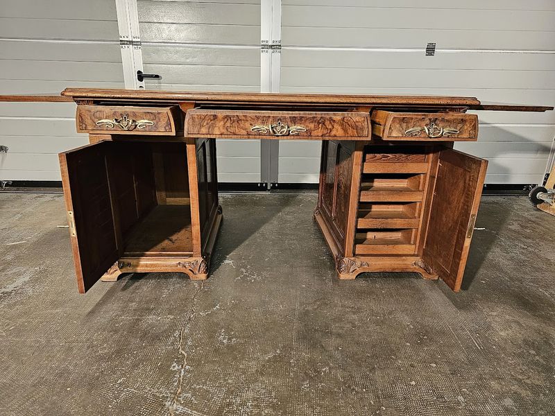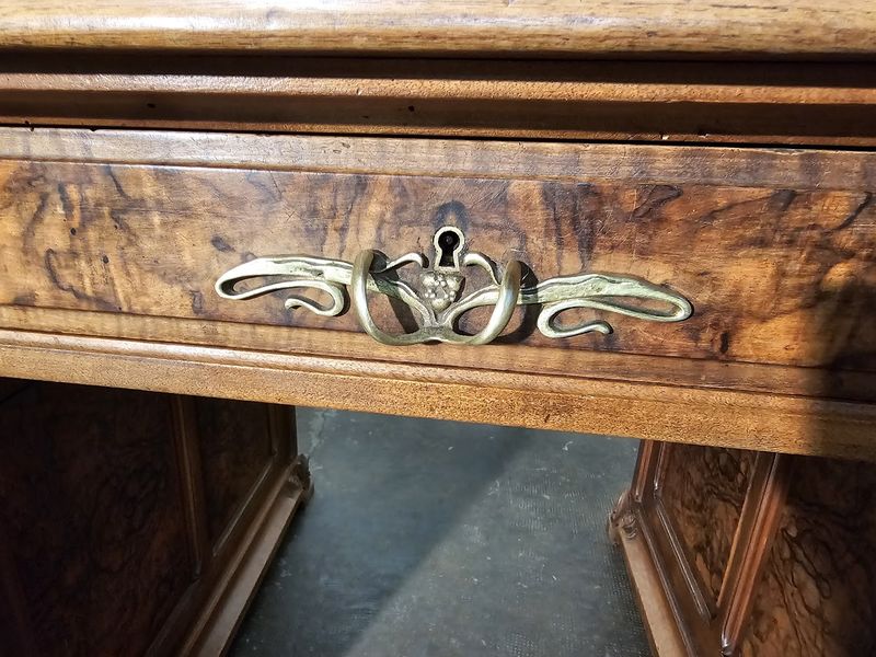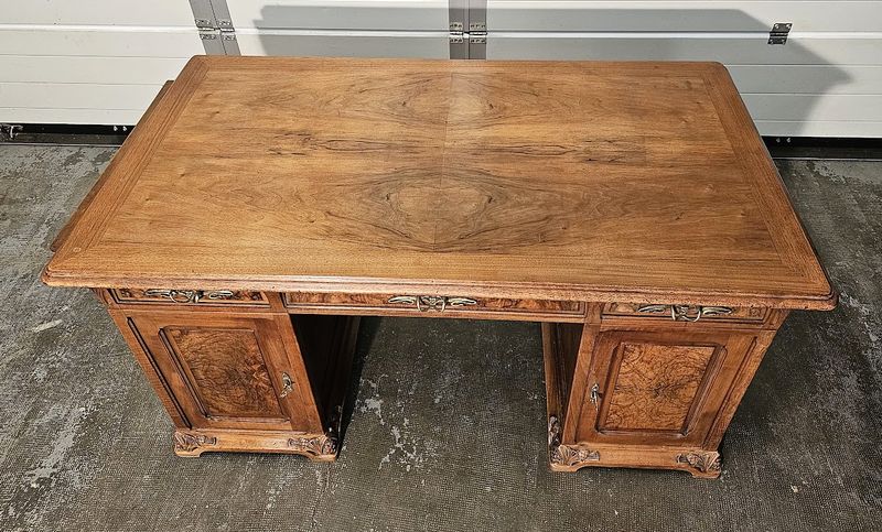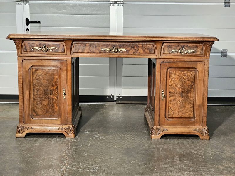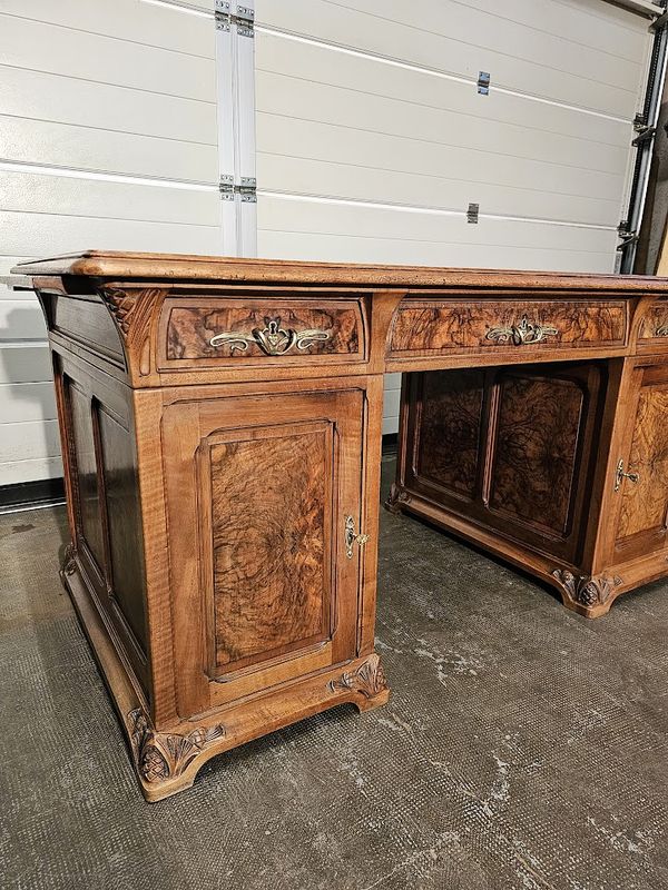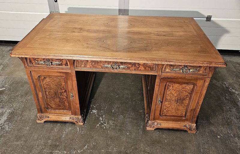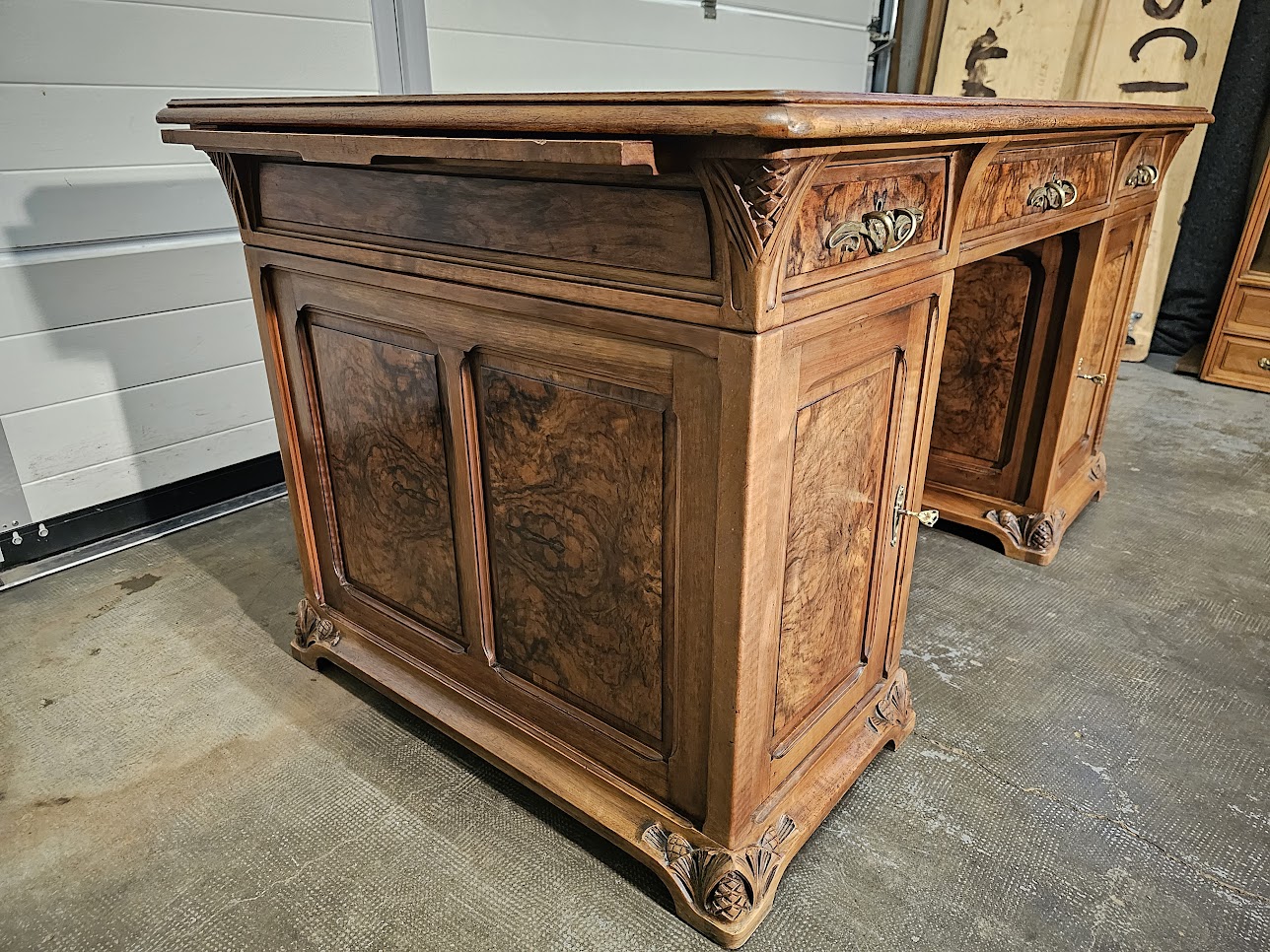 Bureau plat à caisson en noyer massif et placage de noyer dans la ronce, mouluré et sculpté à décor de pommes de pin.