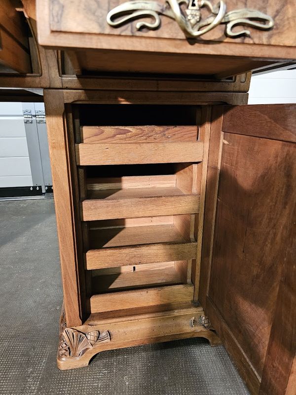 Il ouvre par trois tiroirs en ceinture, ils sont parés de superbes poignées en bronze doré, deux portes sur les caissons et deux tirettes latérales sur le plateau.