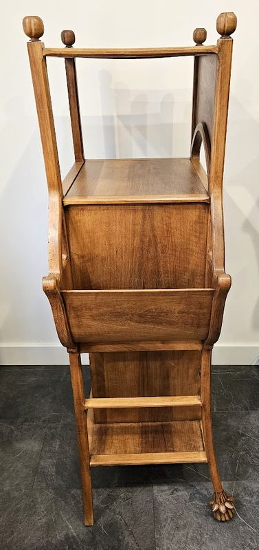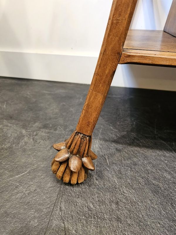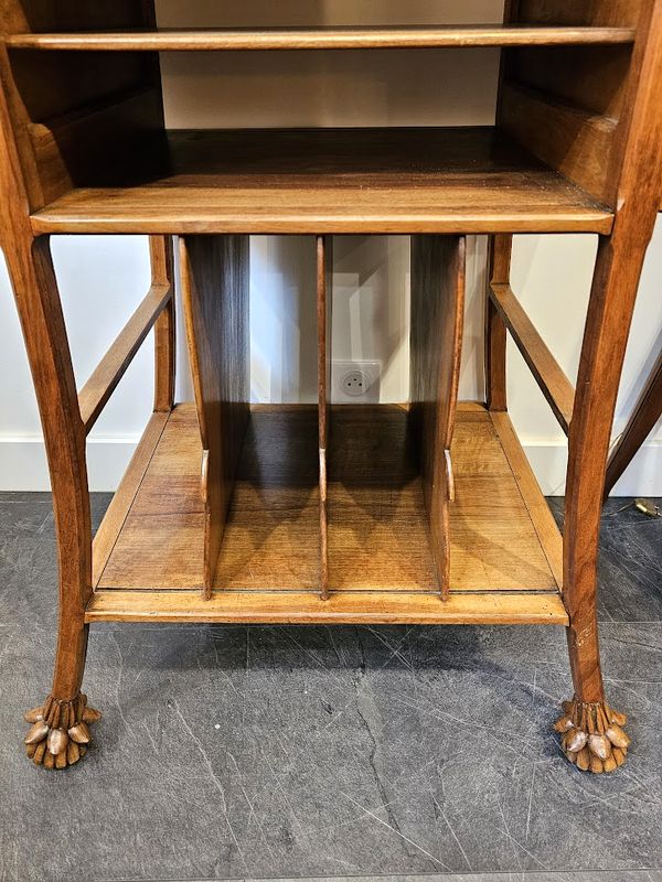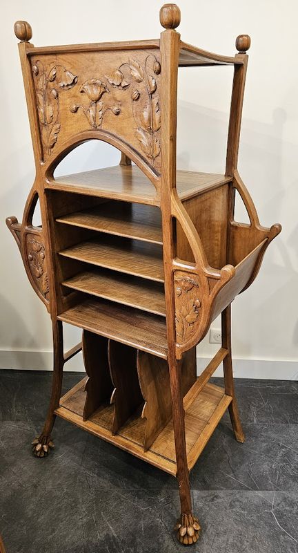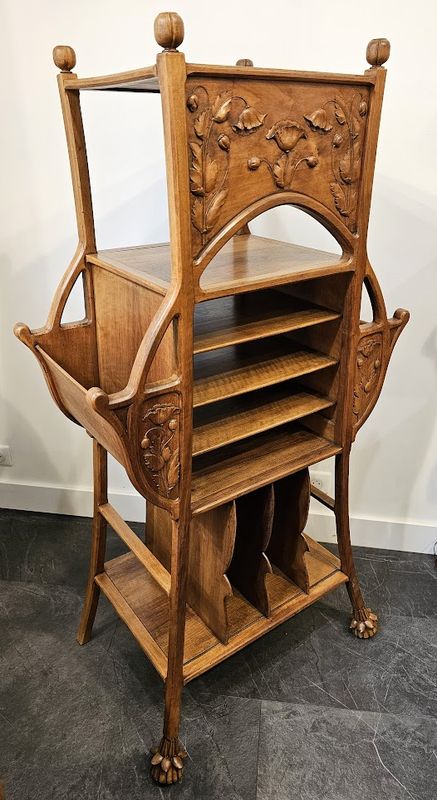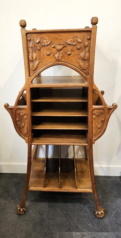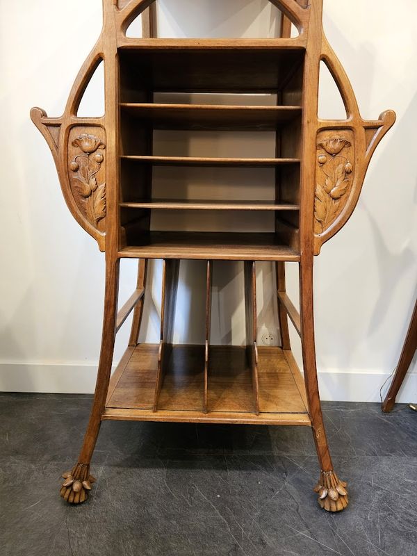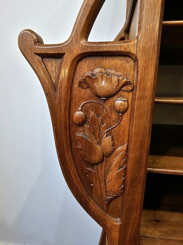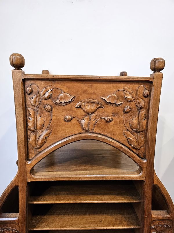 Rare meuble étagère formant casier à musique en noyer massif, sculpté à décor de pavots.