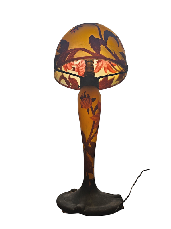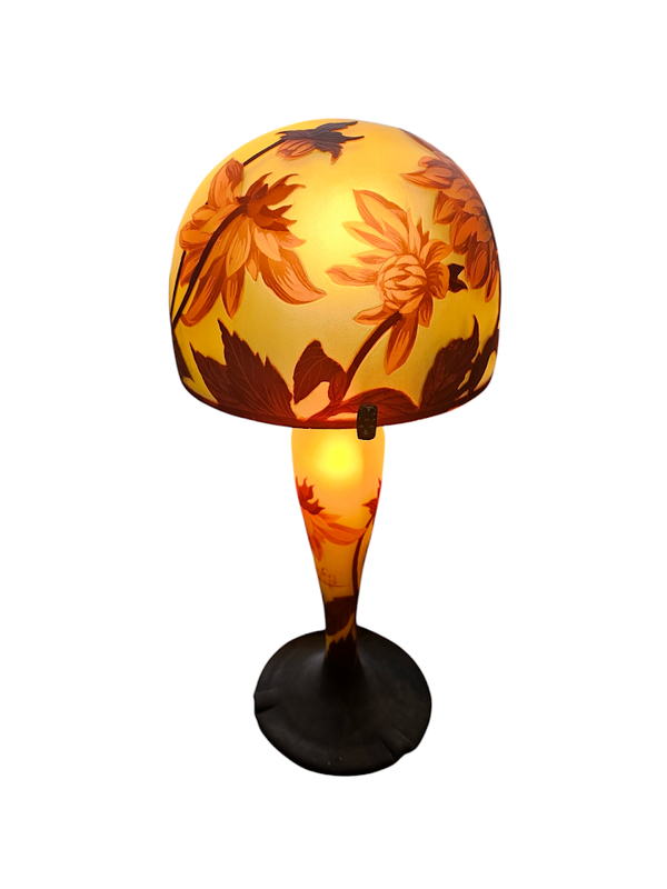 Superbe lampe champignon en verre double, elle se compose d'un piètement balustre à base circulaire et d'un chapeau arrondi.