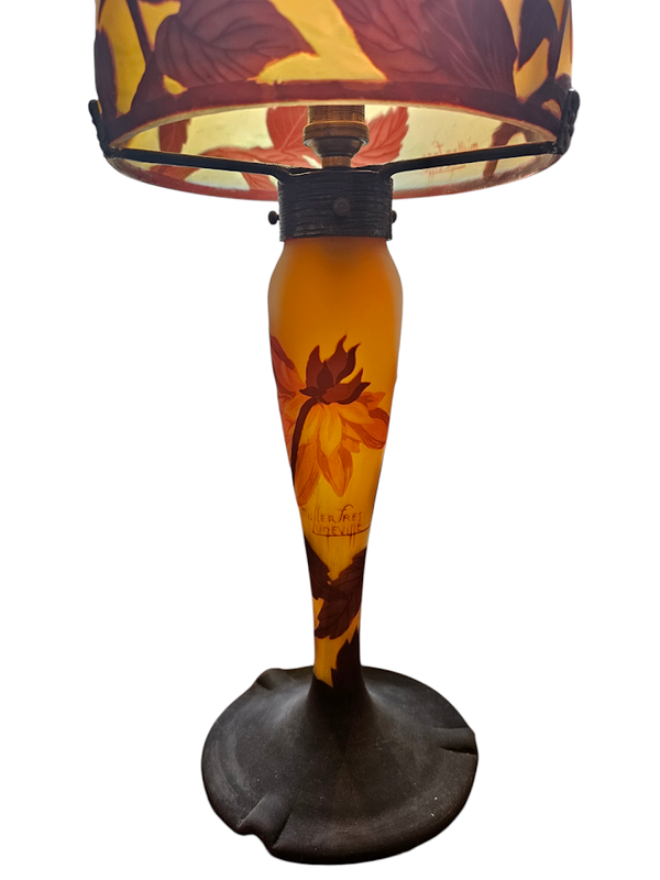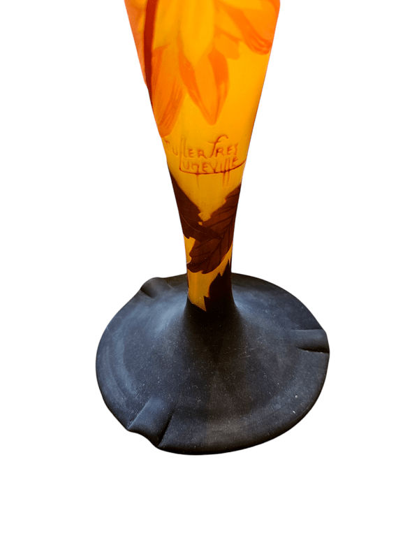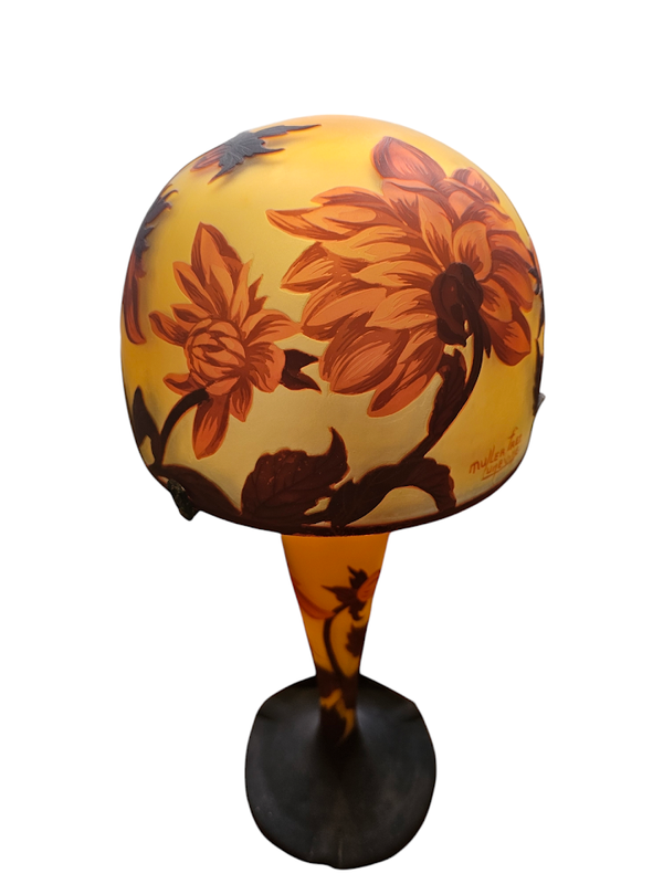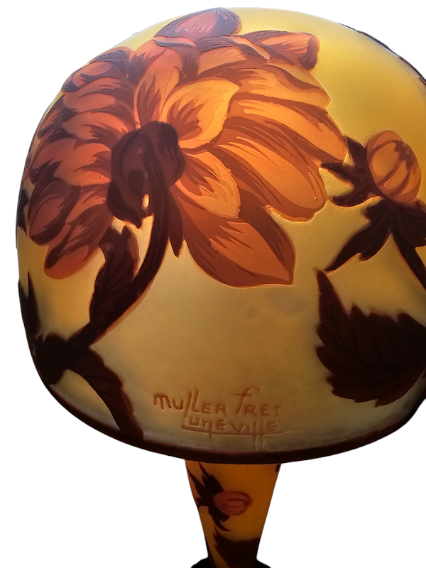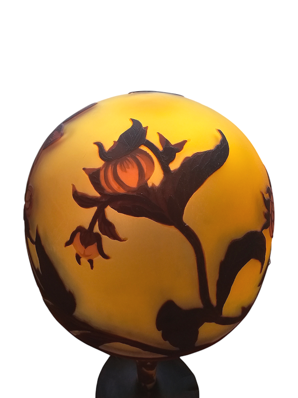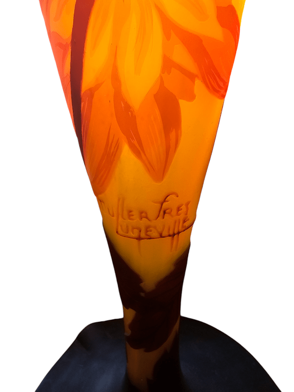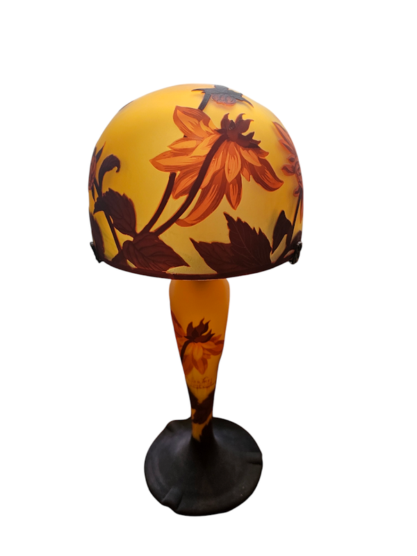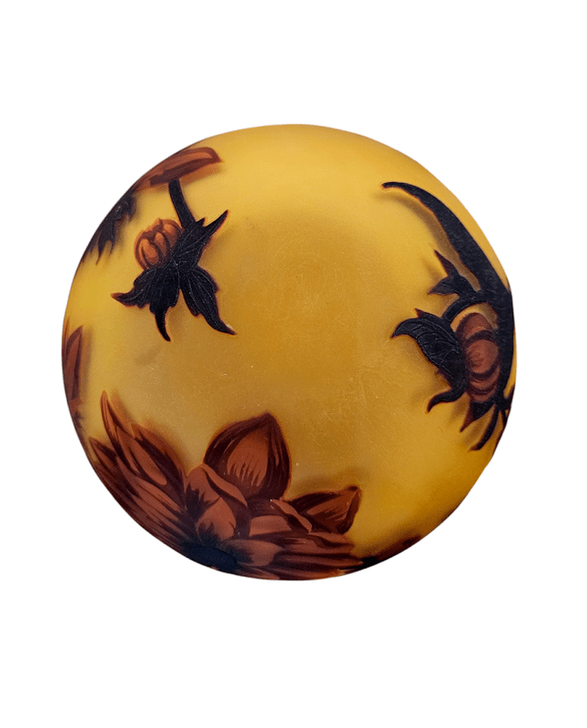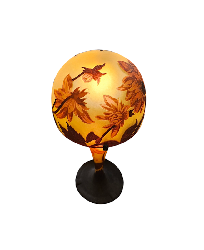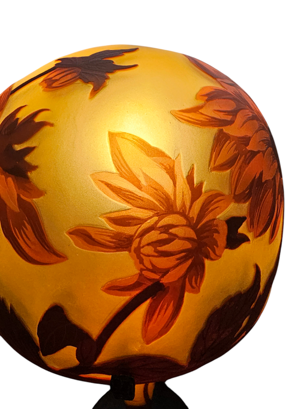 Décor gravé en fines réserves à l'acide de feuillages et de fleurs de dahlias rouges, sur un fond opacifié jaune-orangé.