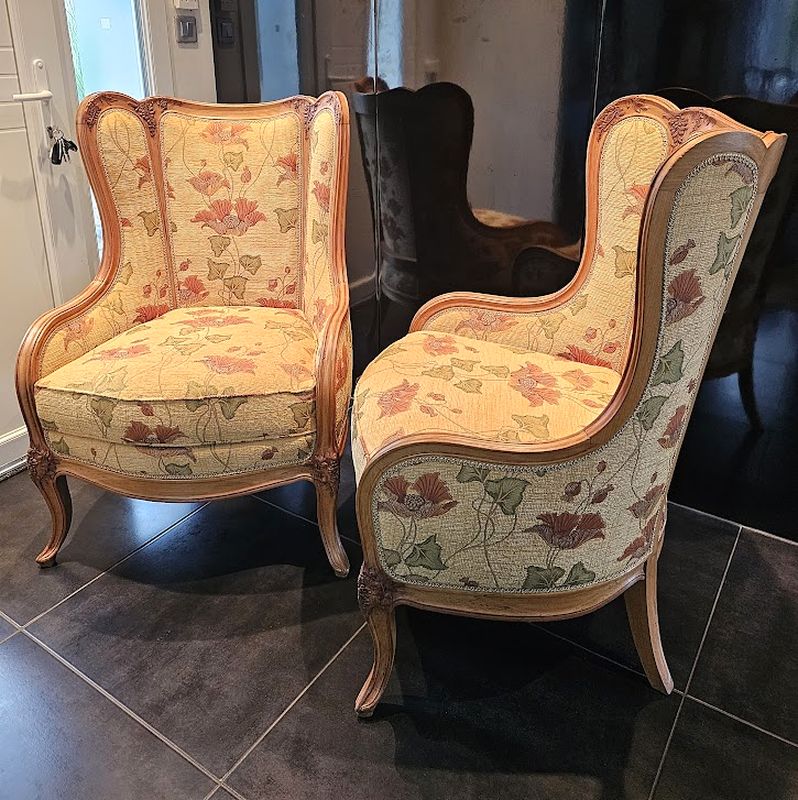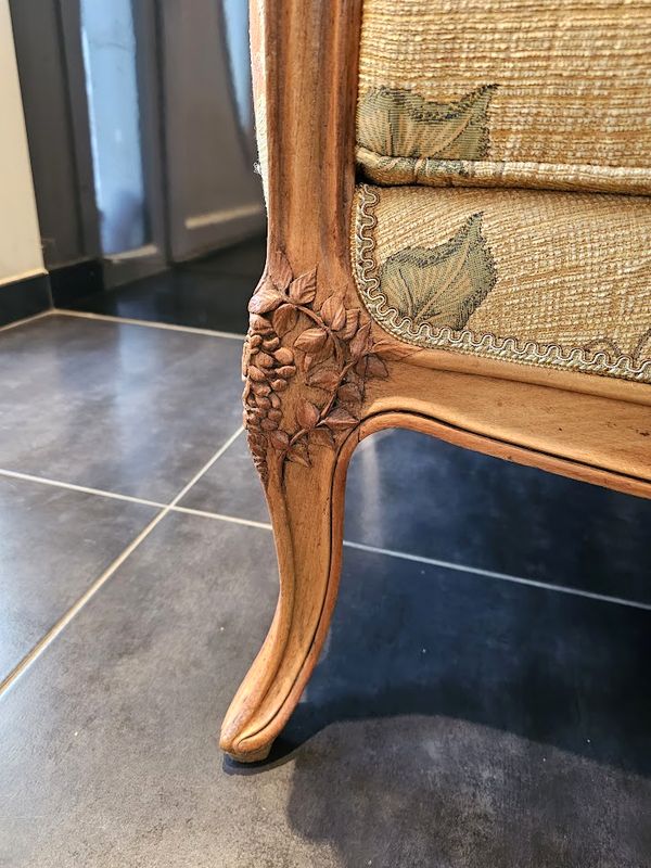 Importante paire de bergères à oreilles en hêtre massif mouluré, galbé et sculpté à décor de glycine.