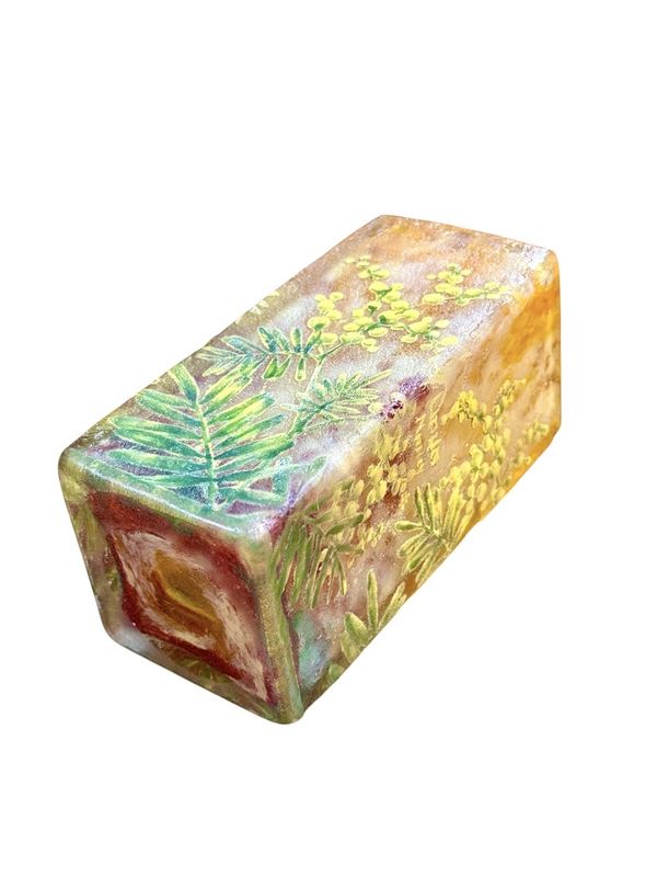 Joli vase de forme quadrangulaire en verre double à inclusion de poudre orange et blanche. Décor finement gravé et émaillé de fleurs de mimosas sur un fond givré. Signature  Daum Nancy à la croix de Lorraine. Belle qualité de réalisation !
