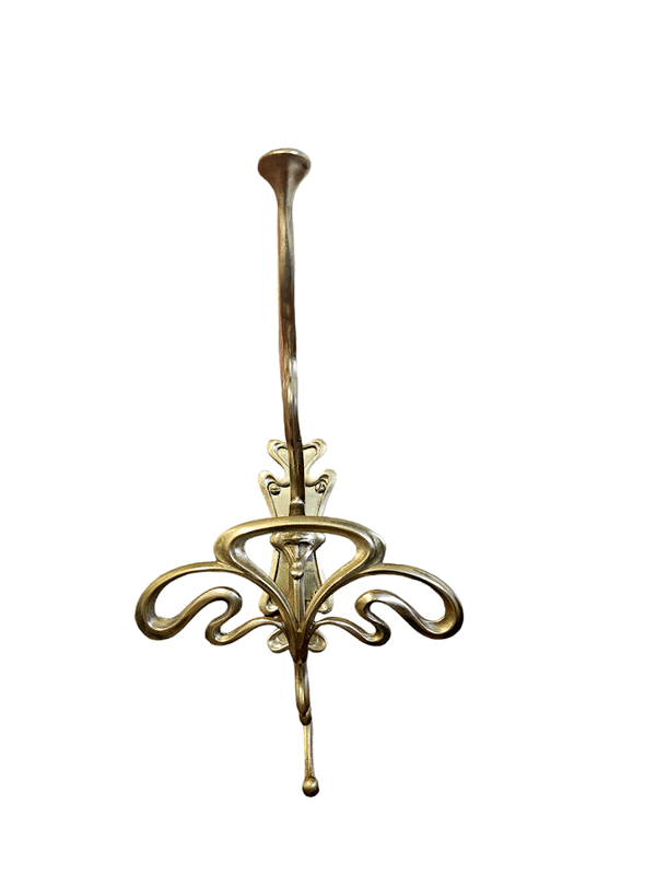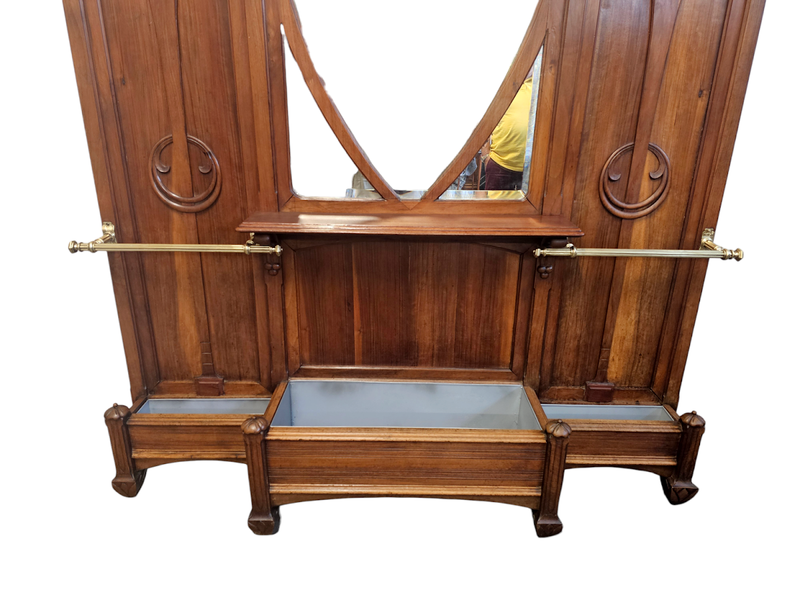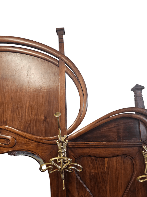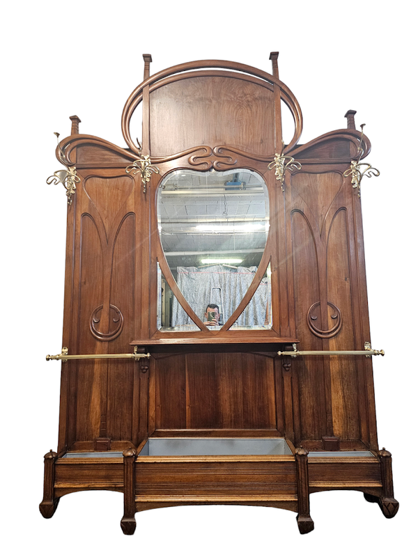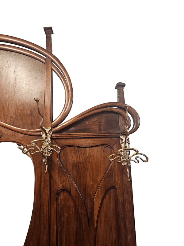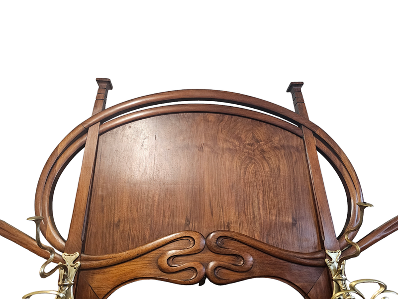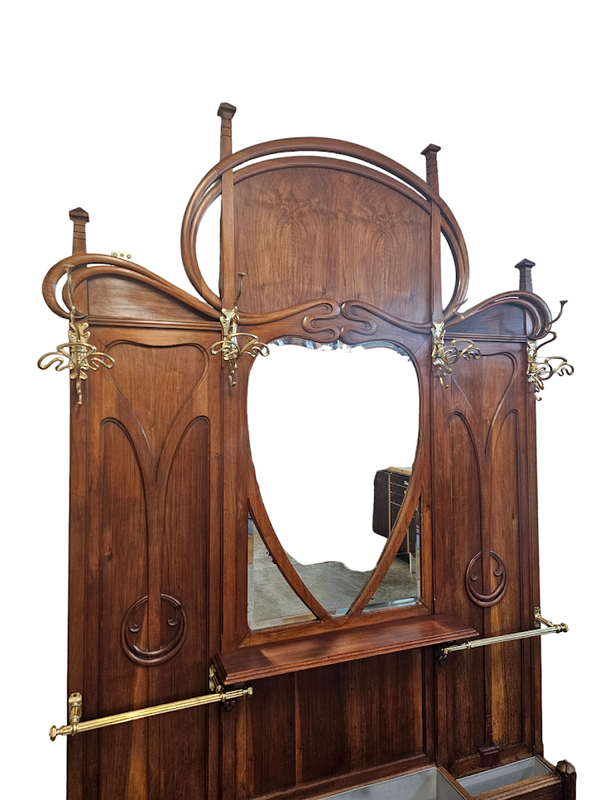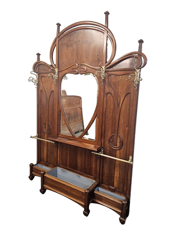 Il présente quatre montants débordant entrecoupés par des traverses arrondies et dédoublées, quatre importantes patères en bronze doré, un miroir biseauté et deux portes parapluies.