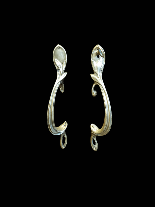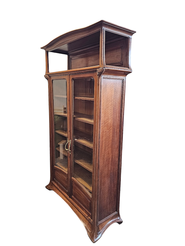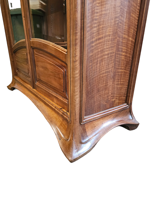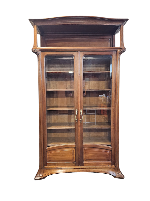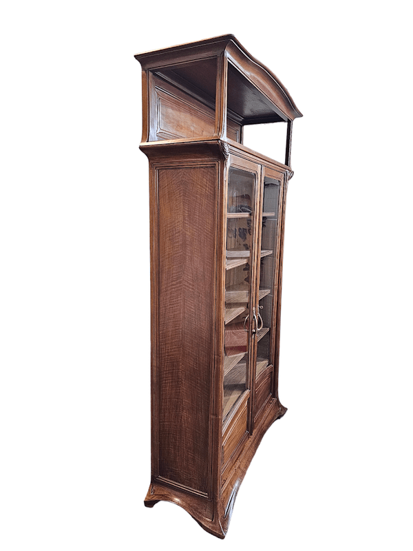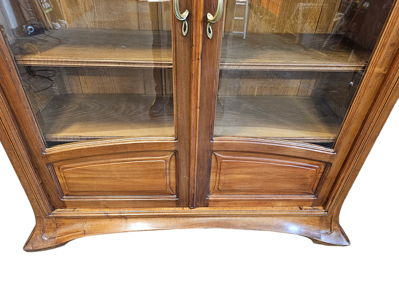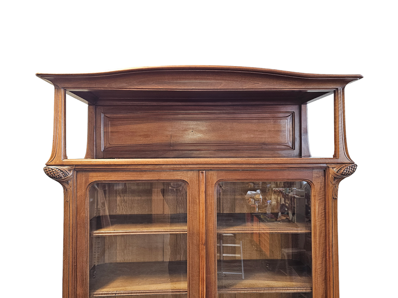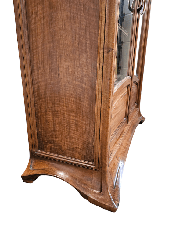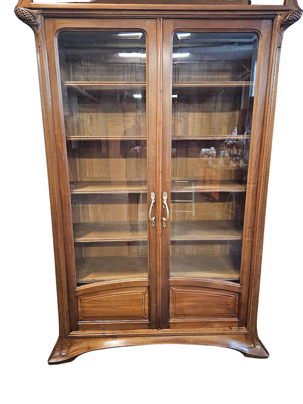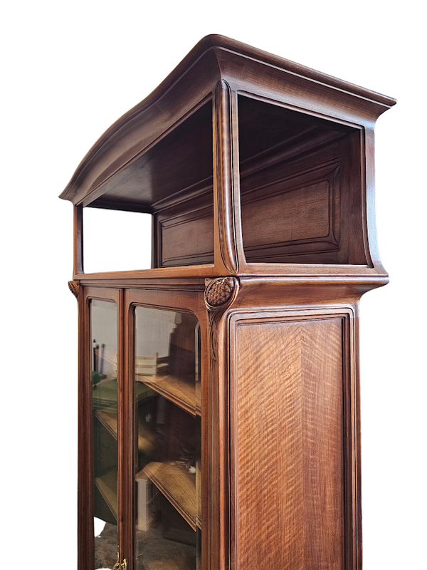 Superbe vitrine en noyer massif mouluré et sculpté à décor de pommes de pin.
