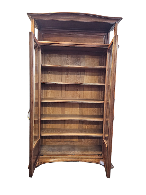 Elle ouvre par deux portes vitrées et panneautées et une grande niche en partie haute, elle repose sur un piétement débordant profondément nervuré et présente des panneaux à plate-bande étirée.